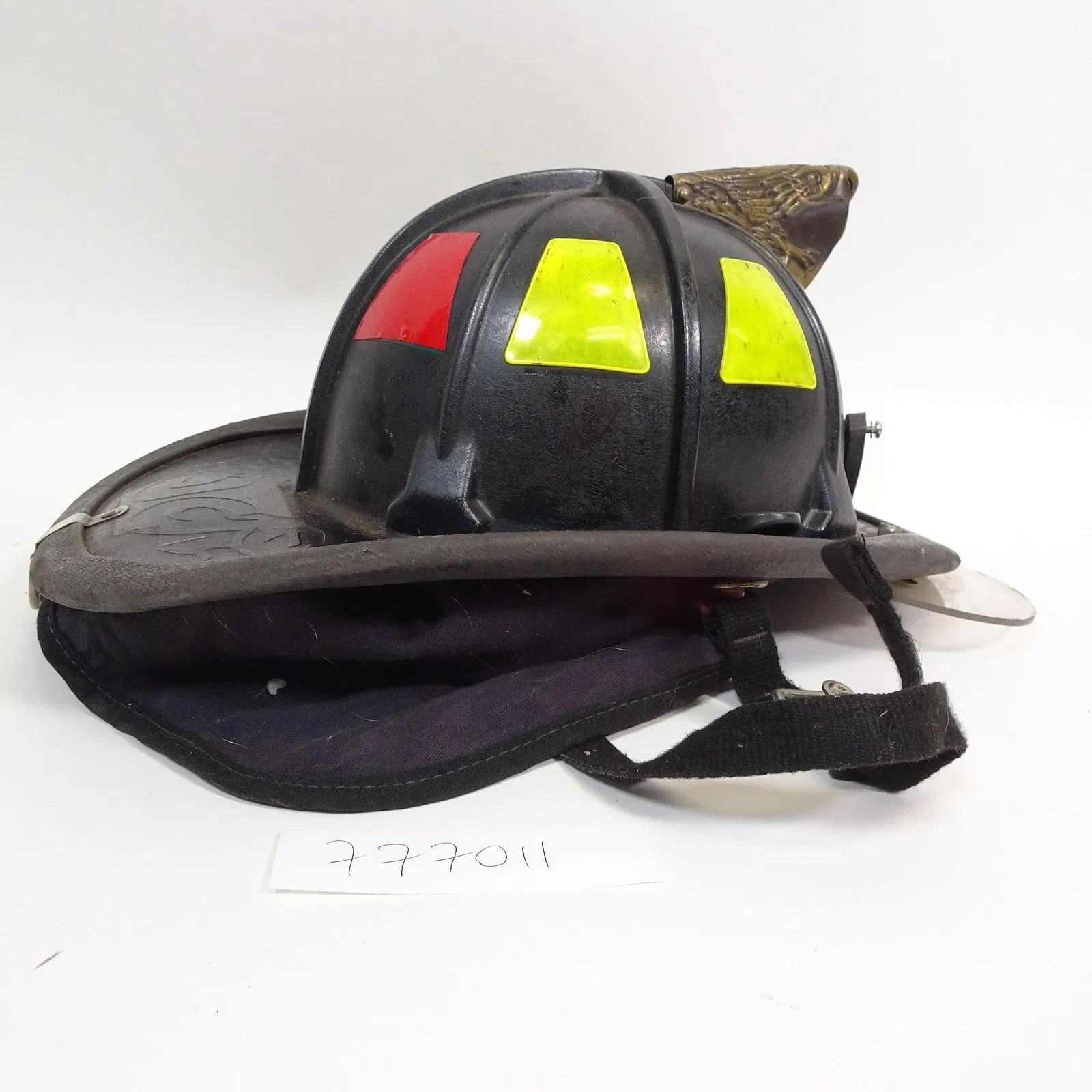 Vintage firefighter helmet in used condition. Black helmet with reflective yellow and red panels.